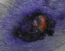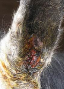 Aby toho jeho trápení nebylo málo, tak v létě 2005 mu na letní pastvině muchyňky v uchu vyďobaly místečko ze kterého sály krev a jemu na tom kousku začalo růst živé maso. To samé na jednom místečku na břiše. Na obrázku boule na břiše je vidět, jak zabírá i léčba leptadlem na bradavice, ale do ucha mám strach, aby s sebou neškubnul a necáklo mu to do oka.
