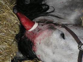 Protože se boule v uchu pořád zvětšovala, museli jsme to řešit operací, boule se totiž přilepila k protilehlé straně boltce a ucho začalo mokvat. Od té doby už má Symbík za sebou operace dvě, pokaždé mu lékař odstranil bouli živého masa a oškrábal a vyříznul i to co bylo v pořádku okolo, takže za 14 dní mu začalo růst to samé ale vždy na větší ploše, navíc během operace se mu tam zanesla infekce (ani se nedivím, nebudu to rozvádět), takže ucho začalo hnisat, a kromě vyhozených peněz za 2 operace jsme tam kde jsme byli. Navíc ochranný obvaz mu vydržel asi 5 minut, pak vstal, oklepal se, obvaz byl dole a začala cákat krev, veterinář už byl za horama a my zůstali s krvácejícím koněm, který na sebe nechtěl nechat šáhnout sami. Radši nebudu popisovat jak se kůň během operace budil a házel s námi po stáji (vet odešel ven, radši nepomáhal, co kdyby se mu něco stalo, z koně stříkala krev a byl hrůzou bez sebe, protože už měl říznuto do ucha, nohy neměl svázané takže se napůl stavěl na nohy a padal - při vzpomínce na tu naši bezmocnost mně polévá studený pot) jak vet celou dobu nezúčastněně telefonoval z mobilu i během operace a měl času na šití dost i když se kůň již probouzel atd. atd. No myslím, že to platí nejen u lidí, že čím vyšší funkce, tím horší doktor. Změnili jsme proto taktiku a začali s domácí léčbou, která dle mého názoru zabírá. Jde o to (na doporučení veterináře) sloupat z živého masa strupy z předchozí léčby a přiložit na to navlhčenou gázu (ne studenou vodou), na které je nasypán buď cukr krupice (rychlejší reakce), nebo cukr krystal (pomalejší reakce) a na cukru granulky hypermanganu a čekat až proběhne reakce. Stručně řečeno jsou to tedy 2-3 čtverce navlhčené gázy, na tom cukr a na cukru hypermangan.