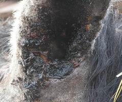 Reakce je velmi bouřlivá, vypadá to trochu jako žíravina z vetřelce, ale připeče se to na ránu a zastaví to růst živého masa. Pálí to a kouří se z toho jako kdyby jste to pálili rozžhaveným železem. Je ale nutné to opakovat a koníček musí být na fajfce, protože normálně by si to nikdy nenechal líbit. Opakovat je to třeba alespoň obden, dokud se to nezastaví. Problém je, že po pár dnech už koník ví co ho čeká a točí se k vám zadkem když k němu jdete. Potom je dobré dát pauzu a získat zpět jeho důvěru a potom pokračovat v léčbě. My chudáka trápíme vč. dvou operací už 5 měsíců (operace říjen 2005, před Silvestrem 2005 a teď je březen s tím, že sami ho léčíme zhruba 2 měsíce), takže se divím, že se s námi ještě baví. Naštěstí úplatky v podobě chleba ještě fungují. Léčili jsme ucho Akriflafinem (žlutý prášek), ale zabírá to jen částečně, takže jsme přešli opět na hypermangan s cukrem a vypadá to nadějně. Doufám, že se nám ho podaří doléčit a stihneme to dřív než zase začnou létat mušky a zanesou do ucha ještě nějakou infekci. Repelent zabírá, ale jen na 6 hodin a pak ty sviňuchy mrňavý začnou zase řádit. No uvidíme, jak se to bude dál vyvíjet.